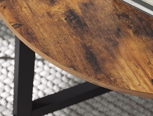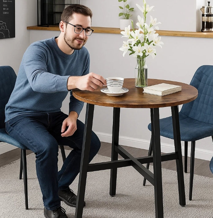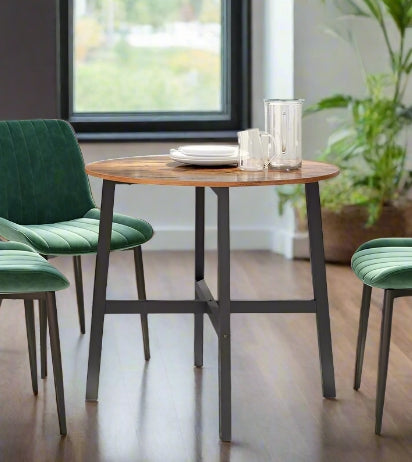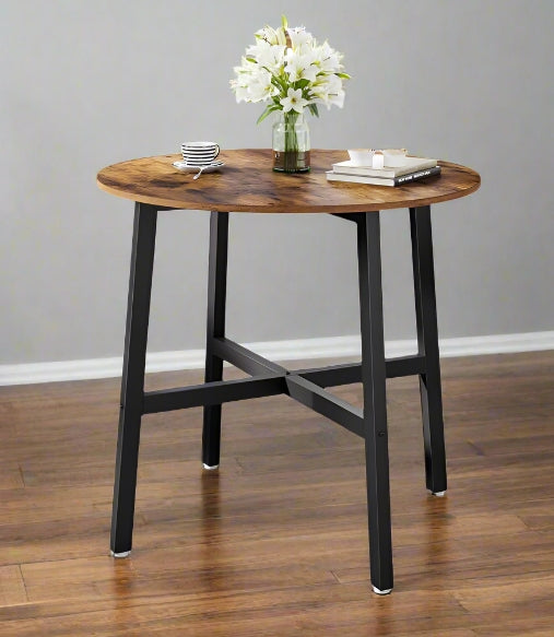 Round Dining Table, Rustic Brown Top with Black Steel Frame, Industrial Style for Kitchen or Office