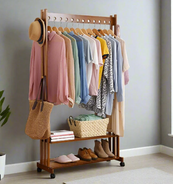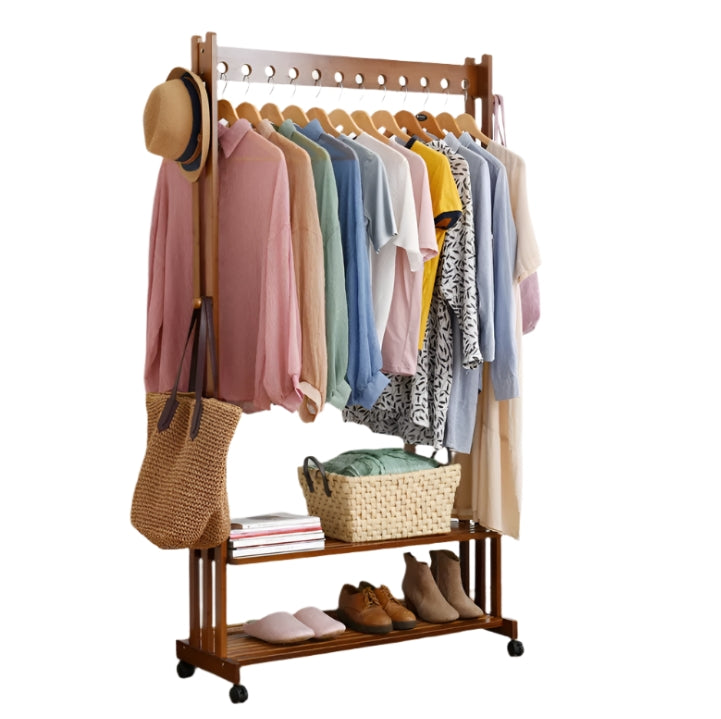 Rustic Bamboo Clothes Rail Rack with Rolling Wheels, Two-Tier Shoe Shelves, Adjustable Top Shelf