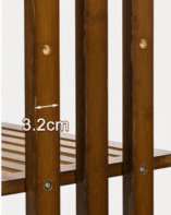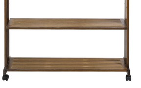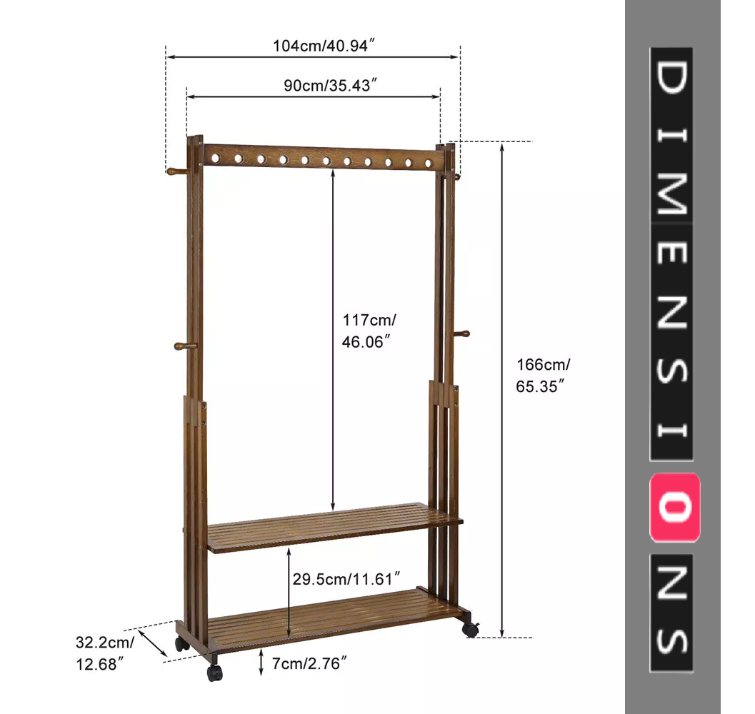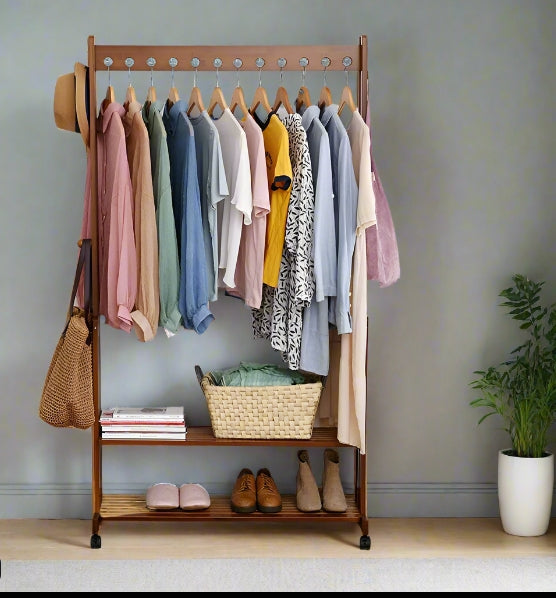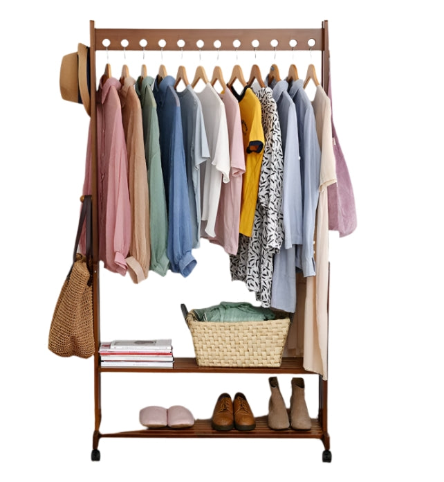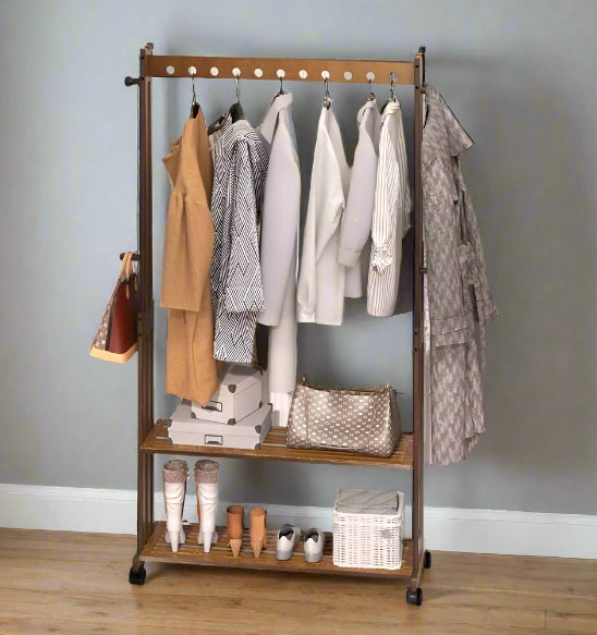 Organize your garments and shoes effortlessly with this rustic bamboo clothes rail rack. Designed for durability and style, it features two thick shelves for shoes and baskets, an adjustable top shelf, and multiple side hooks for handbags and accessories. The smooth-rolling 360° swivel casters (two lockable) make it easy to move around, while the sturdy bamboo construction ensures long-lasting use. Its warm walnut wood finish and simple design add a charming centerpiece to any bedroom, hallway, or living room.