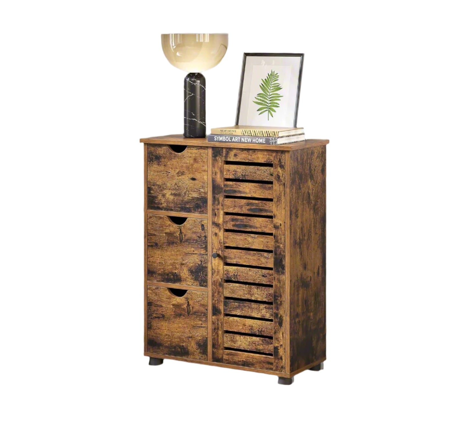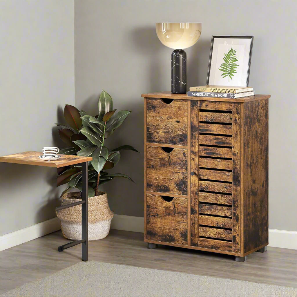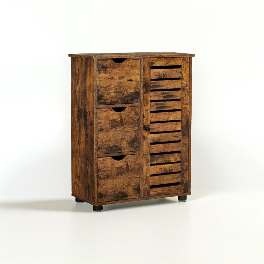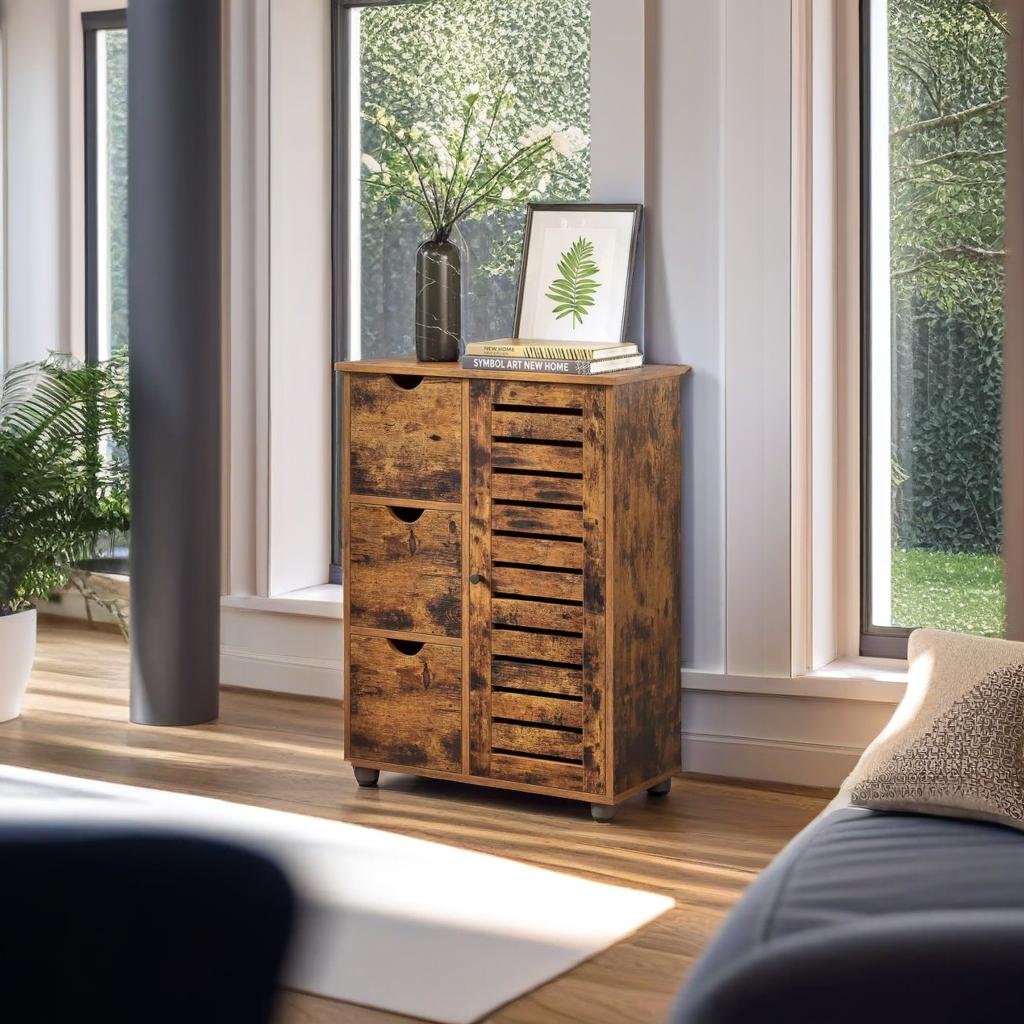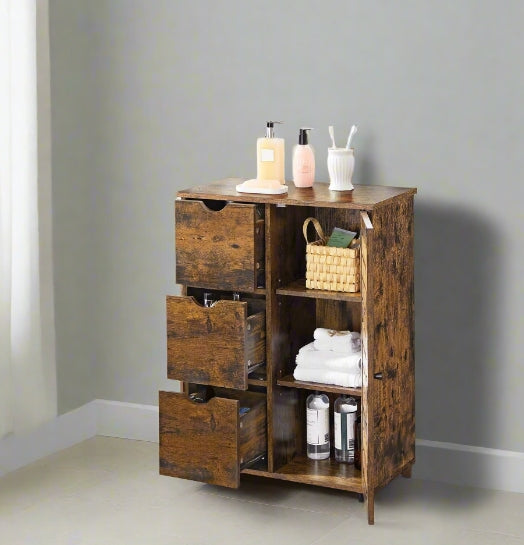 Rustic Bathroom Floor Cabinet with 3 Drawers & Adjustable Shelves – Wooden Storage Unit for Bathroom