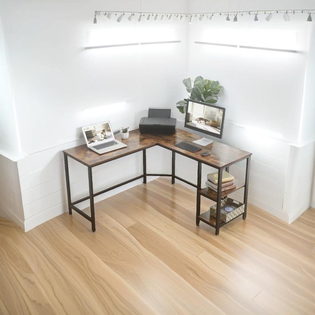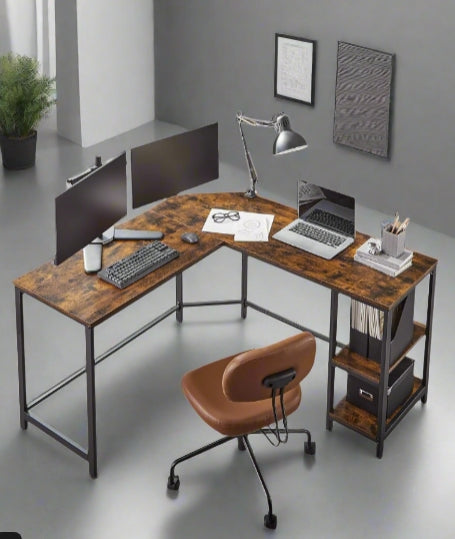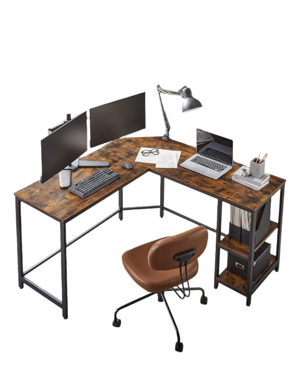 Enhance your home office or gaming setup with this spacious L-shaped computer desk, designed for optimal efficiency and style. The large 138 x 138 cm desktop accommodates multiple monitors, keyboards, and accessories, keeping everything within easy reach. Featuring two open storage shelves—one removable to fit a computer tower or store books and files—this desk offers flexible organisation options. A smart cut-off corner at the back enables seamless cable management, reducing clutter and maintaining a clean workspace. Built with a sturdy steel frame and high-quality particleboard in a rustic brown and black finish, this desk supports up to 50 kg for long-lasting durability.