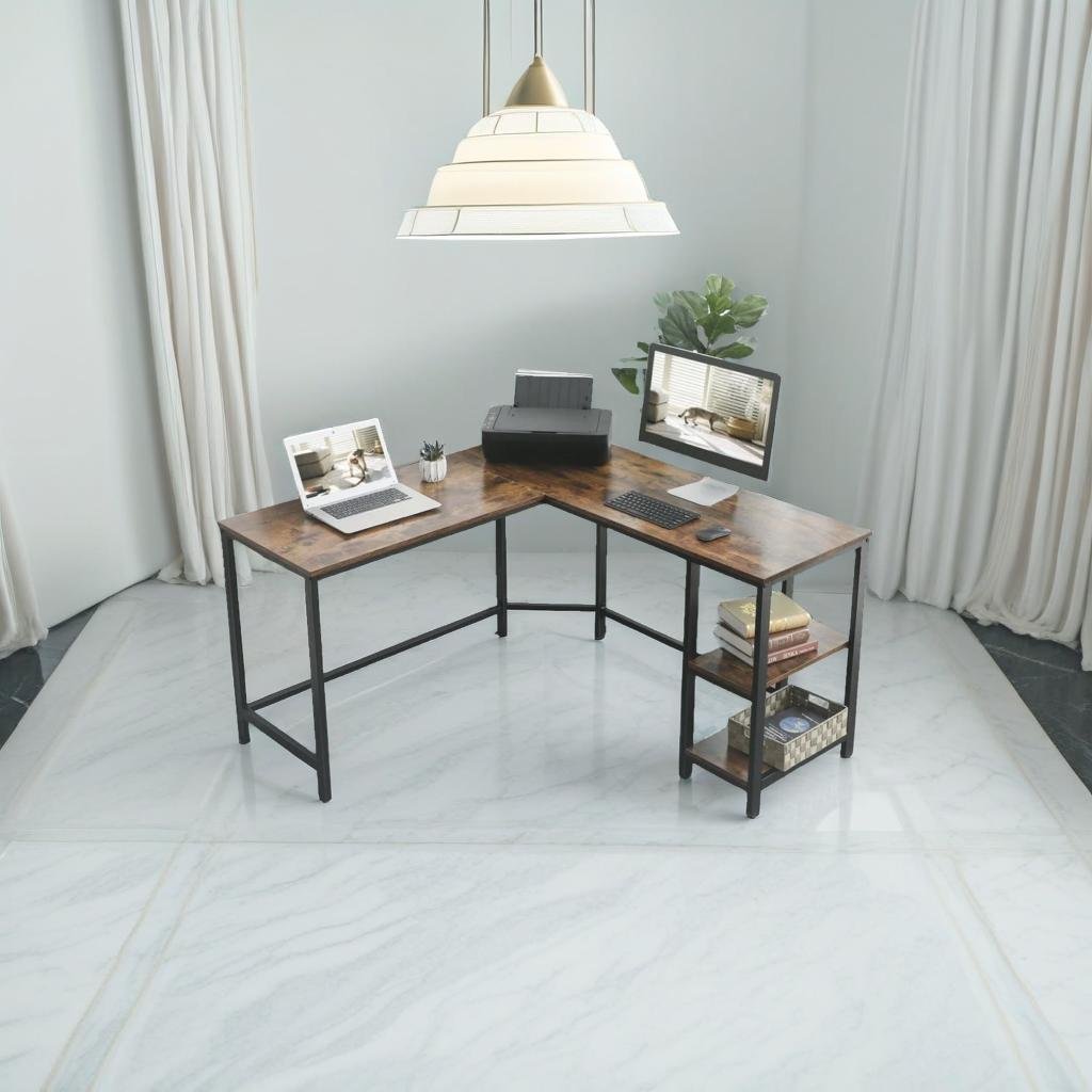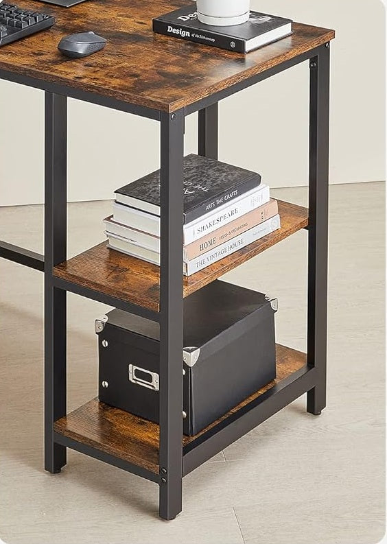 Rustic Brown & Black L-Shaped Computer Desk with Storage Shelves – 138x138 cm