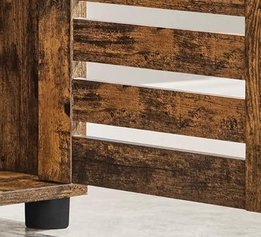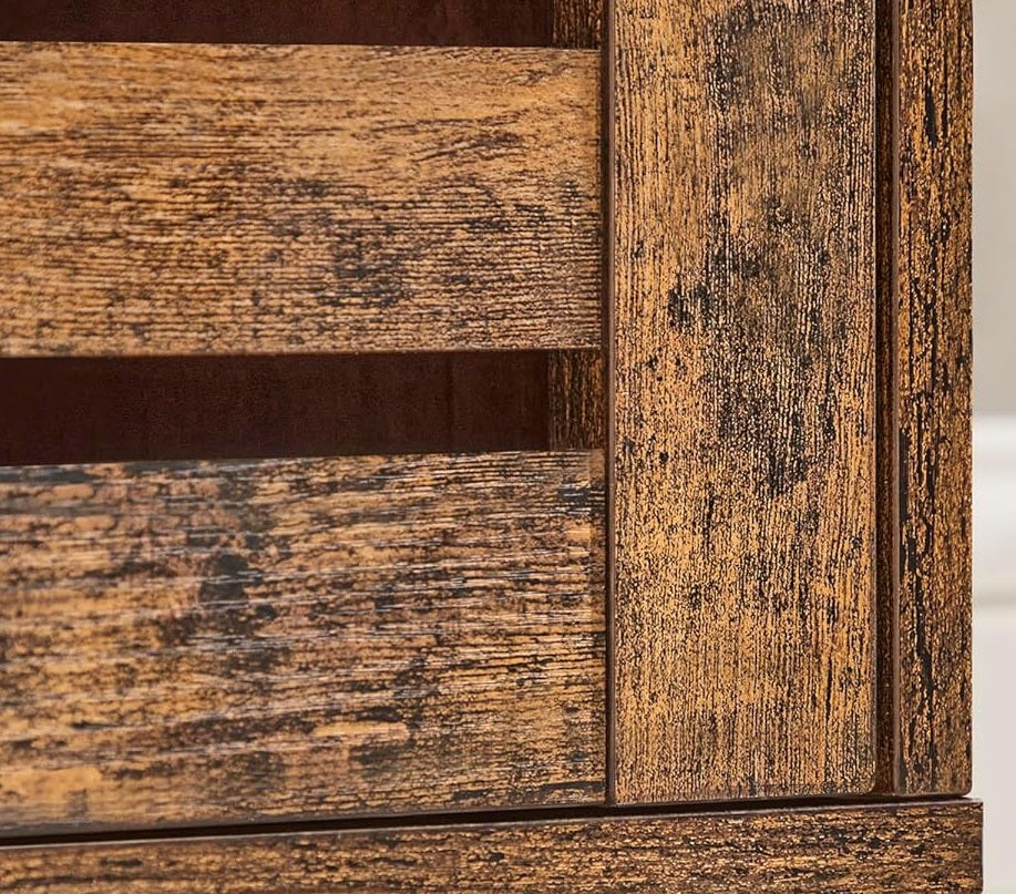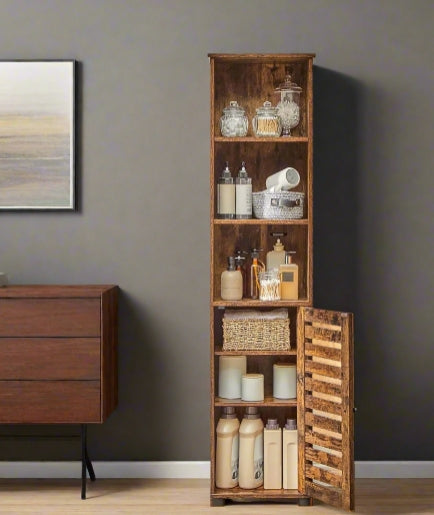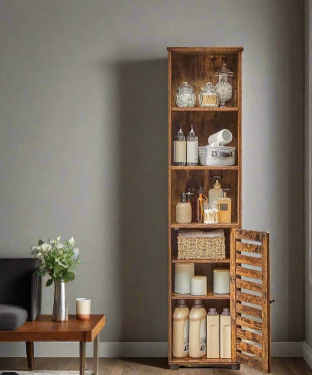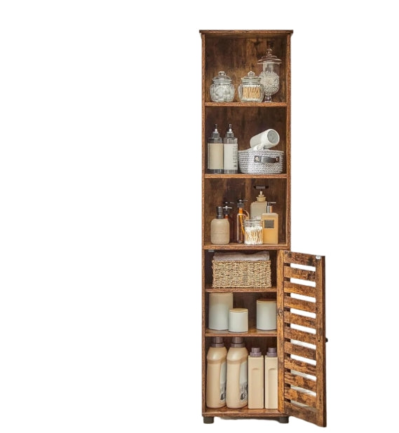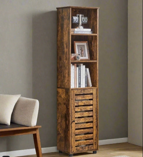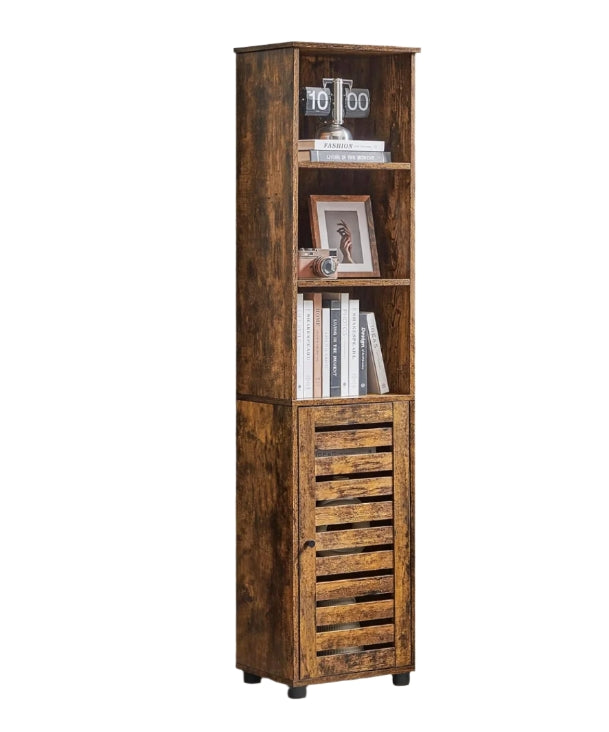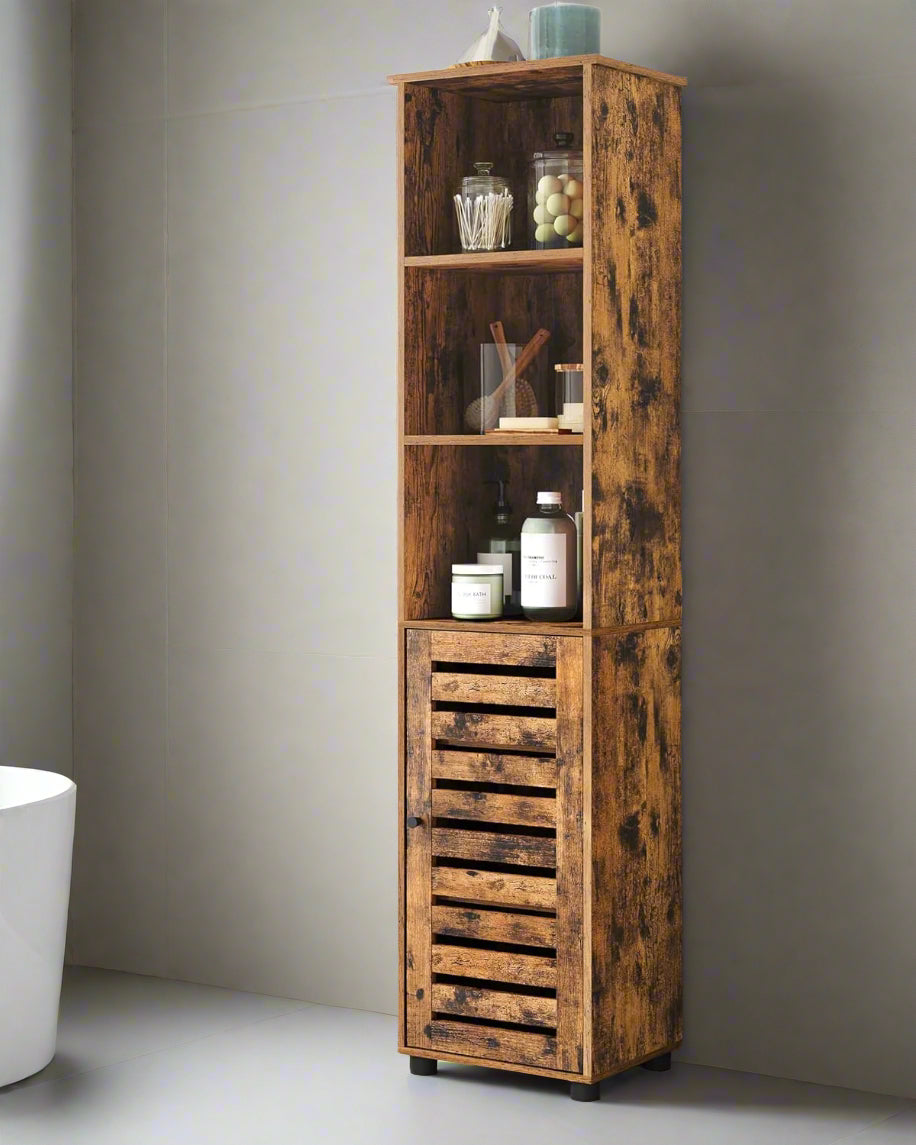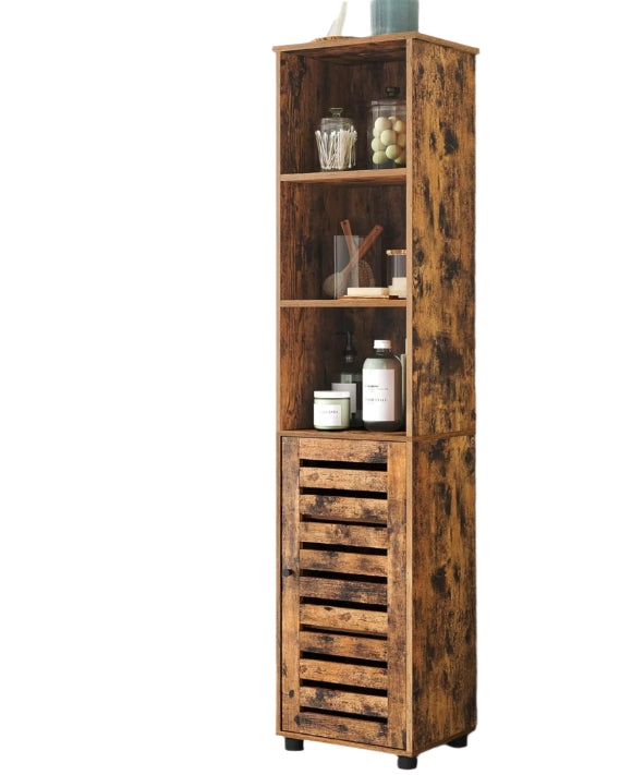 Add functional storage and rustic charm to any room with this tall floor cabinet. Featuring 3 open compartments for everyday essentials and a door-covered section with 2 adjustable shelves, it helps keep your home organised while giving you flexibility to store both tall and small items. The rich brown wood finish brings a warm, vintage touch that complements a range of décor styles.