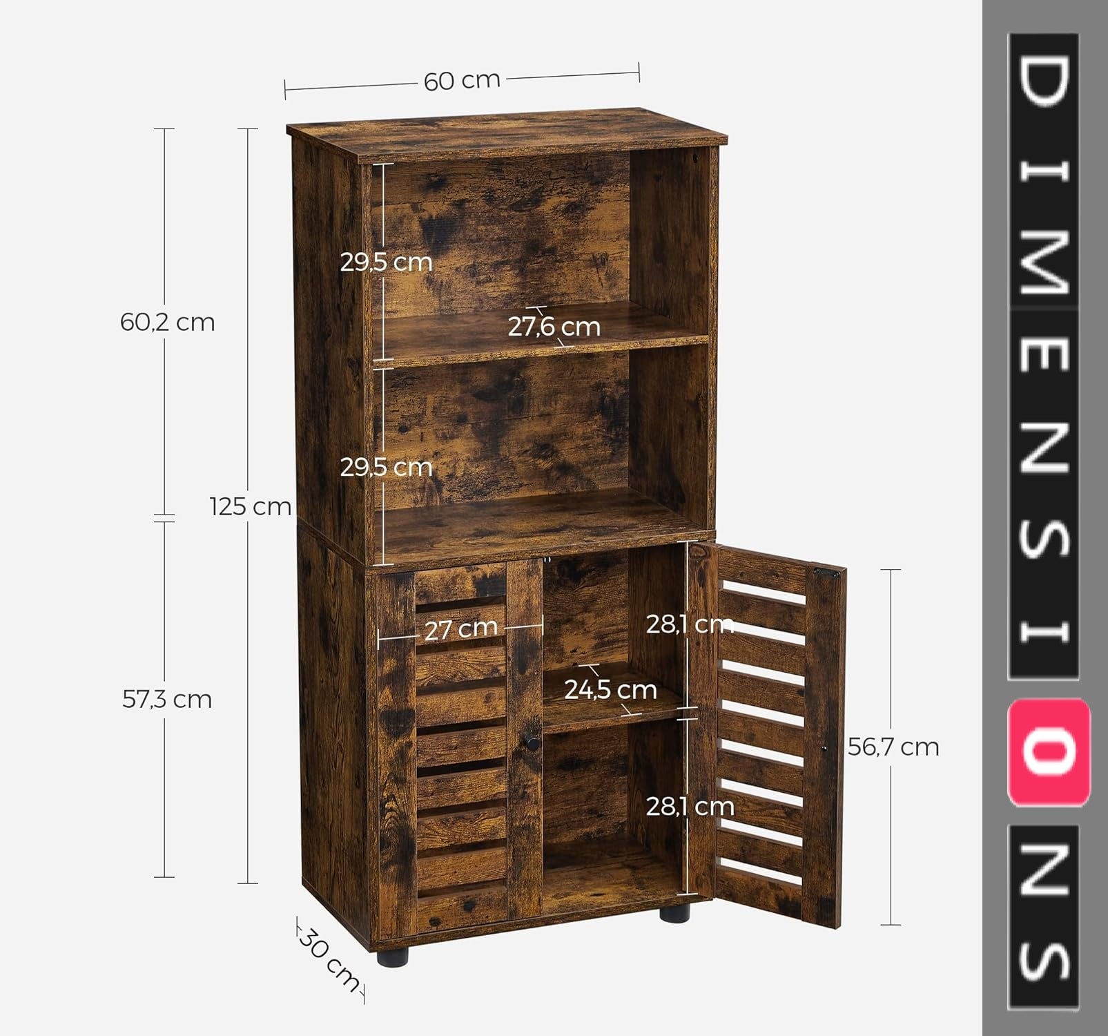 Maximize your storage options with this rustic brown floor standing cabinet, designed to blend vintage charm with practical functionality. Featuring two open compartments and a double-door cupboard with a height-adjustable shelf, this versatile cabinet offers flexible storage to suit your needs. Whether placed in your living room, kitchen, or study, its elegant wood grain finish and chic louvered doors add a stylish accent to any space.