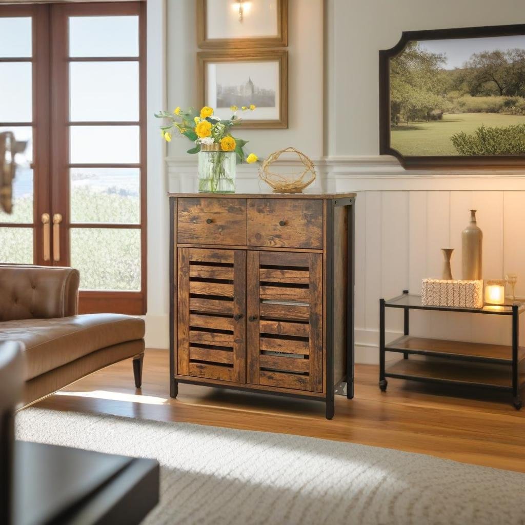 Compact storage, rustic charm. This freestanding floor cabinet blends timeless aesthetics with functional design, making it a perfect fit for your hallway, bedroom, living room, or office. Finished in warm rustic brown with louvered doors and sleek metal legs, it’s a stylish addition to any room.