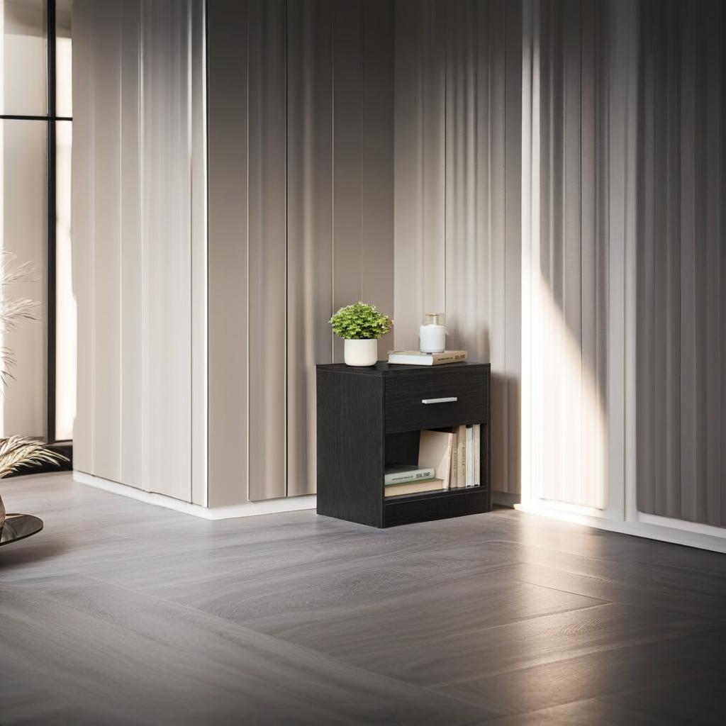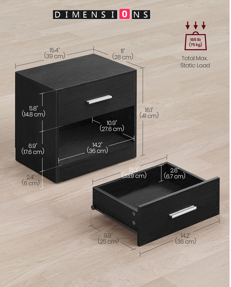 This set of 2 bedside tables features a modern, minimalist design with clean lines, effortlessly blending into any living space. Crafted from durable particleboard with high-quality fittings, each table boasts a robust structure capable of supporting up to 75 kg in total, while the drawer can hold up to 5 kg.