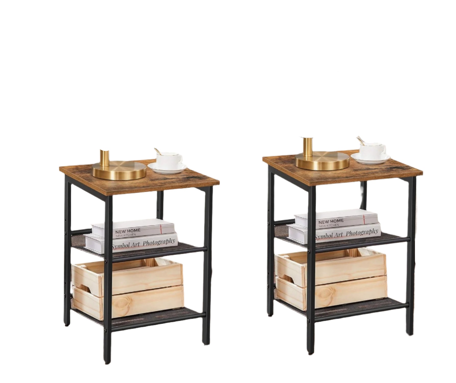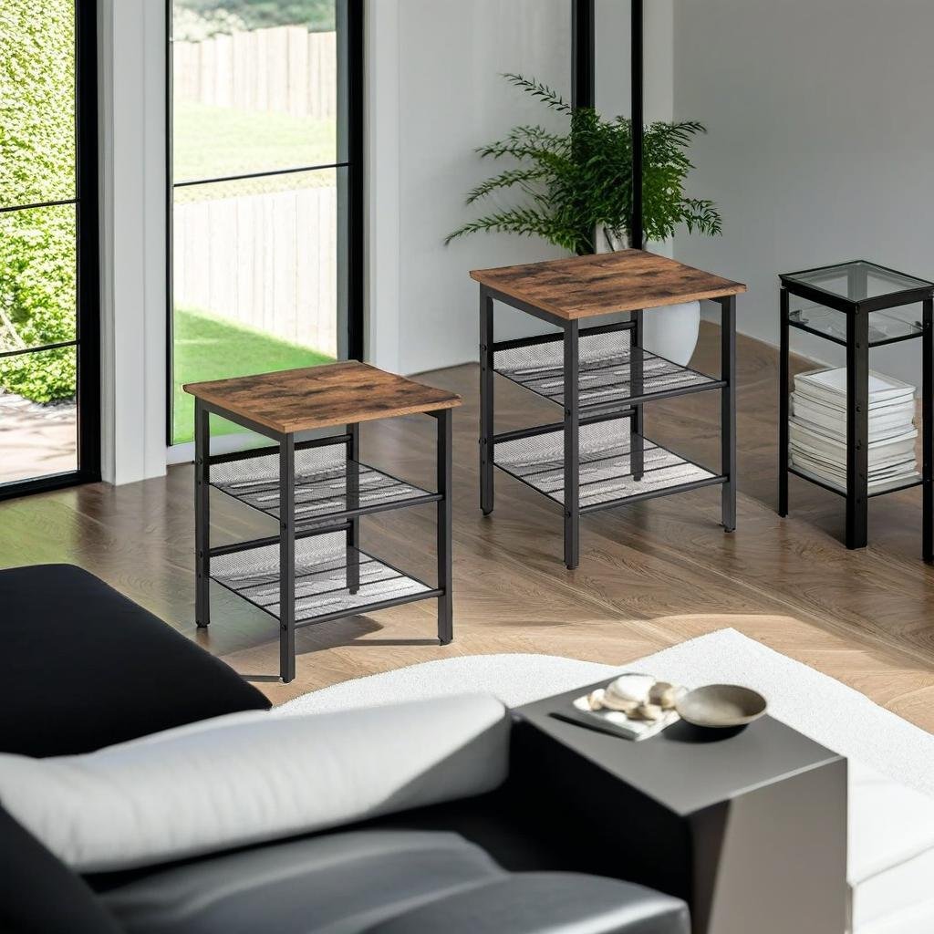 Set of 2 Industrial Side Tables – Rustic Brown & Black Nightstands with Adjustable Mesh Shelves