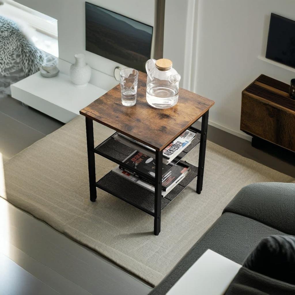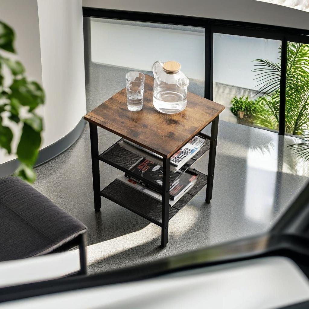 Each table features two adjustable mesh shelves—choose flat or slanted positioning to hold books, magazines, or electronics just the way you like. The black steel frame and rustic brown top combine for a sturdy build that supports up to 20 kg per table, while adding a modern, urban touch to any room.