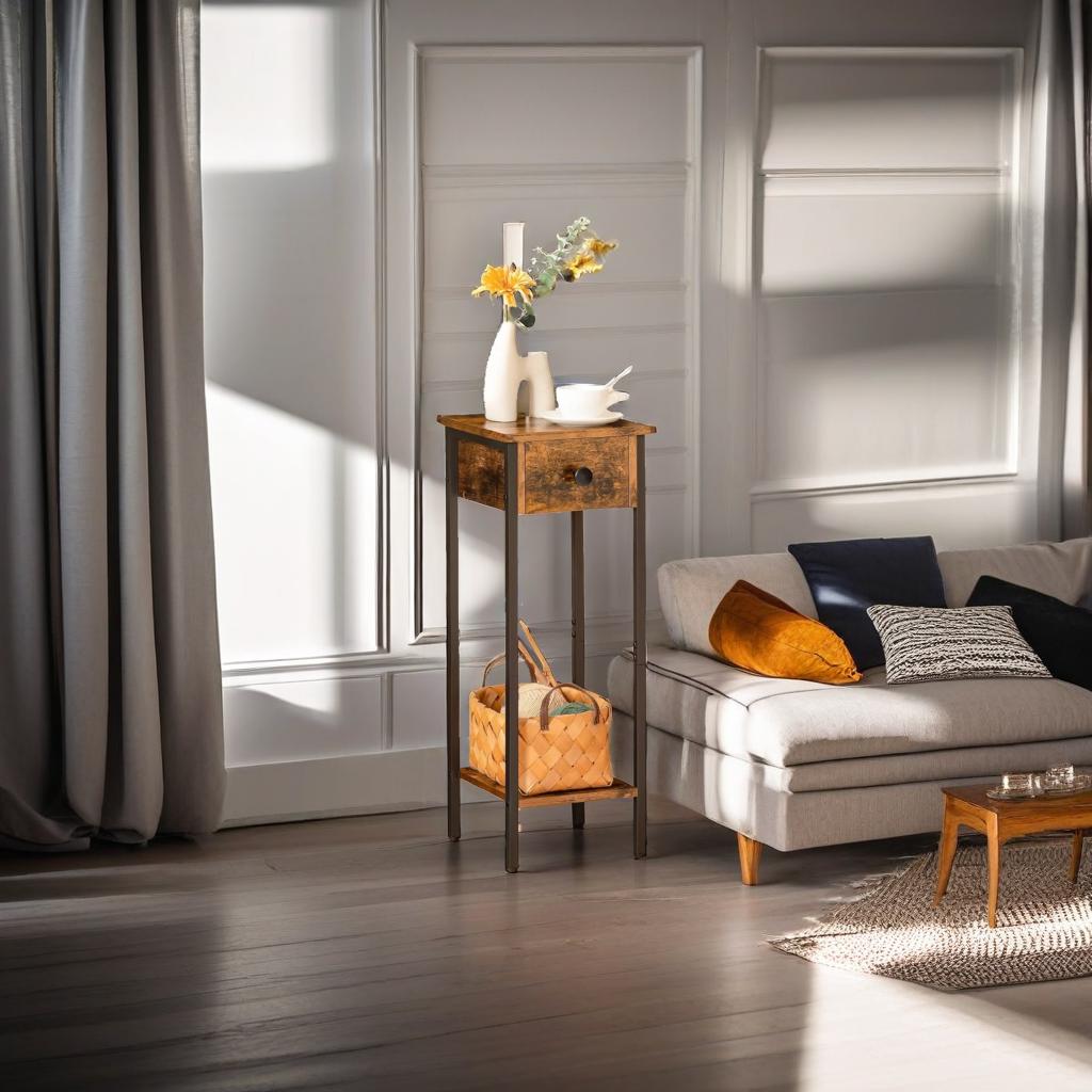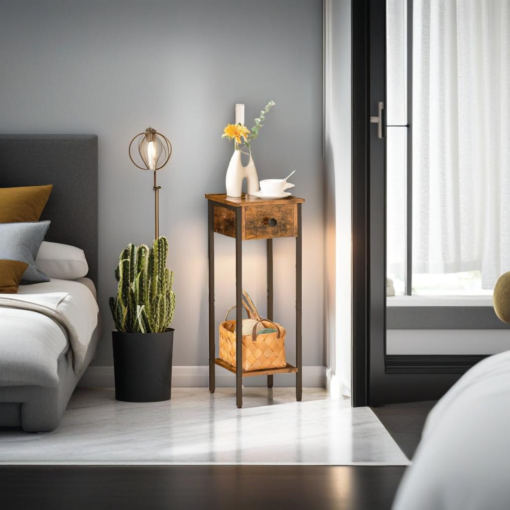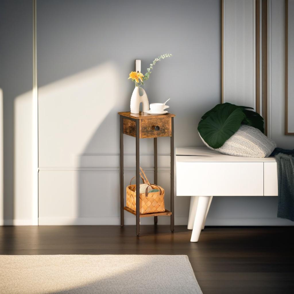 This slim bedside table is a versatile and practical addition to any room, designed to optimize storage in compact spaces. It features a functional layout with a spacious drawer, a sturdy bottom shelf, and a smooth tabletop, providing ample room to organize and display your belongings. Whether used for holding your bedtime essentials, showcasing decorative items, or storing small accessories, this table keeps everything neat and within easy reach.