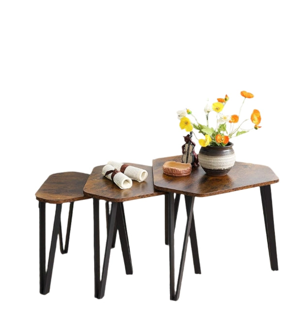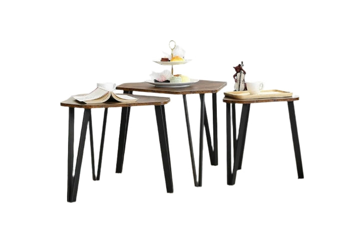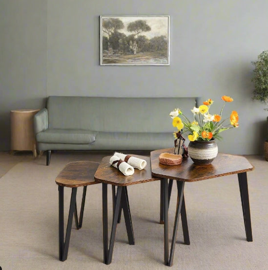Set of 3 Rustic Brown Nesting Coffee Tables with Steel Frames - Industrial Style