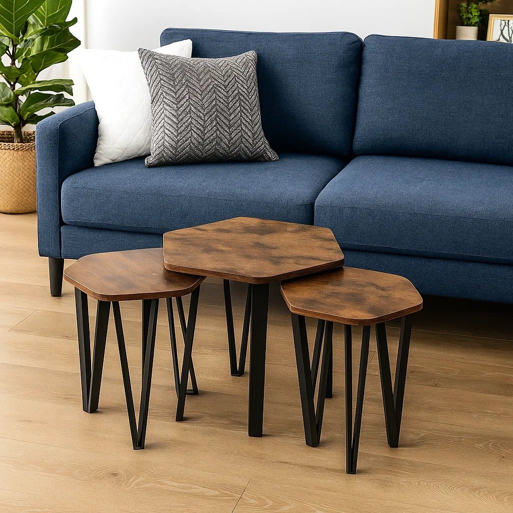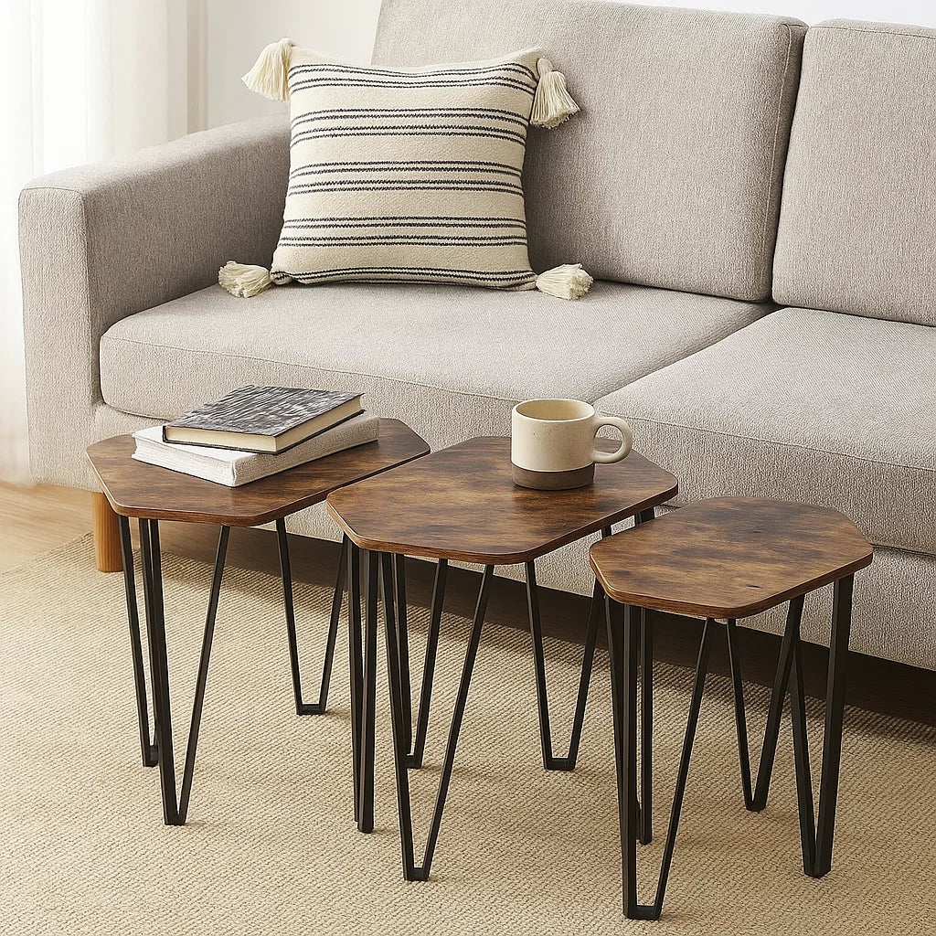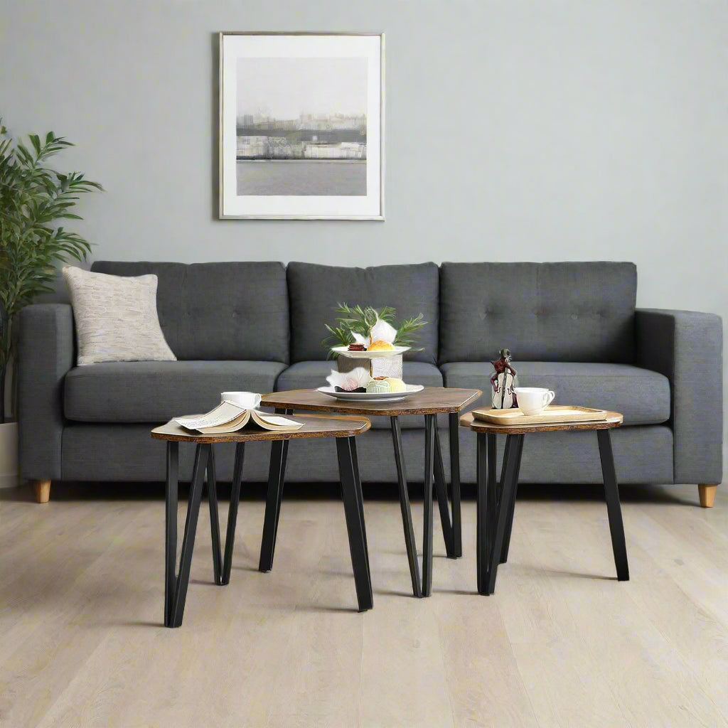 Bring a touch of industrial rustic charm to your living space with this set of 3 nesting coffee tables. Featuring warm rustic brown wooden tops paired with sturdy black steel frames, these tables combine vintage style with modern durability. Perfect for entertaining, you can separate the tables for easy access to drinks and snacks or nest them together to save space when not in use.