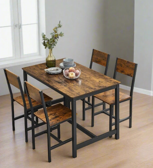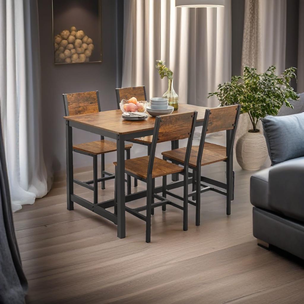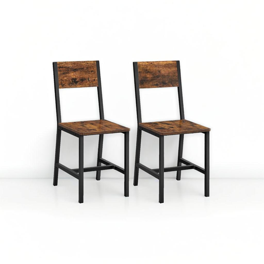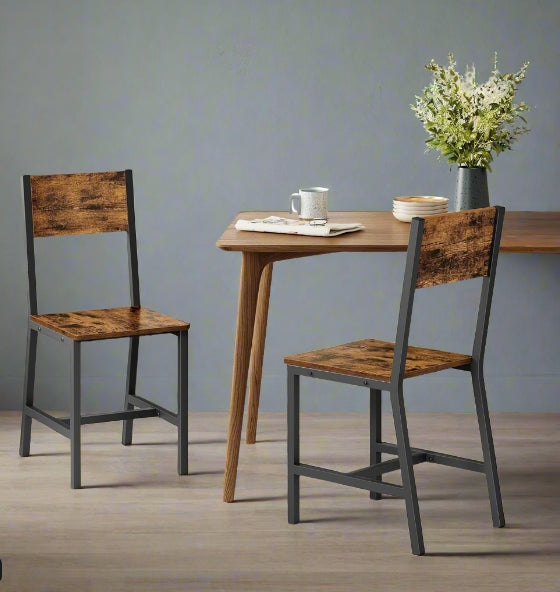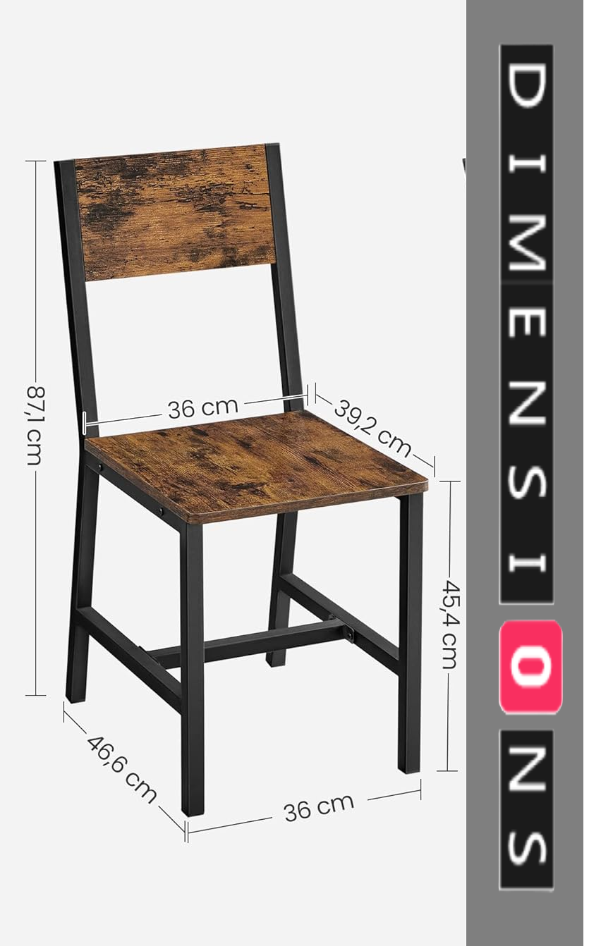 Elevate your dining space with this stylish set of 4 industrial dining chairs, featuring a sturdy ink black steel frame paired with warm rustic brown particleboard seats. Designed with comfort in mind, the ergonomic 102° angle between the backrest and seat supports you during every meal. The strong steel frame and bottom crossbar ensure maximum stability, while the easy-to-follow assembly instructions make setup a breeze. Perfect for your dining room, kitchen, or living room, these chairs blend functionality with rustic charm to complement a variety of interior styles. (NO TABLE)