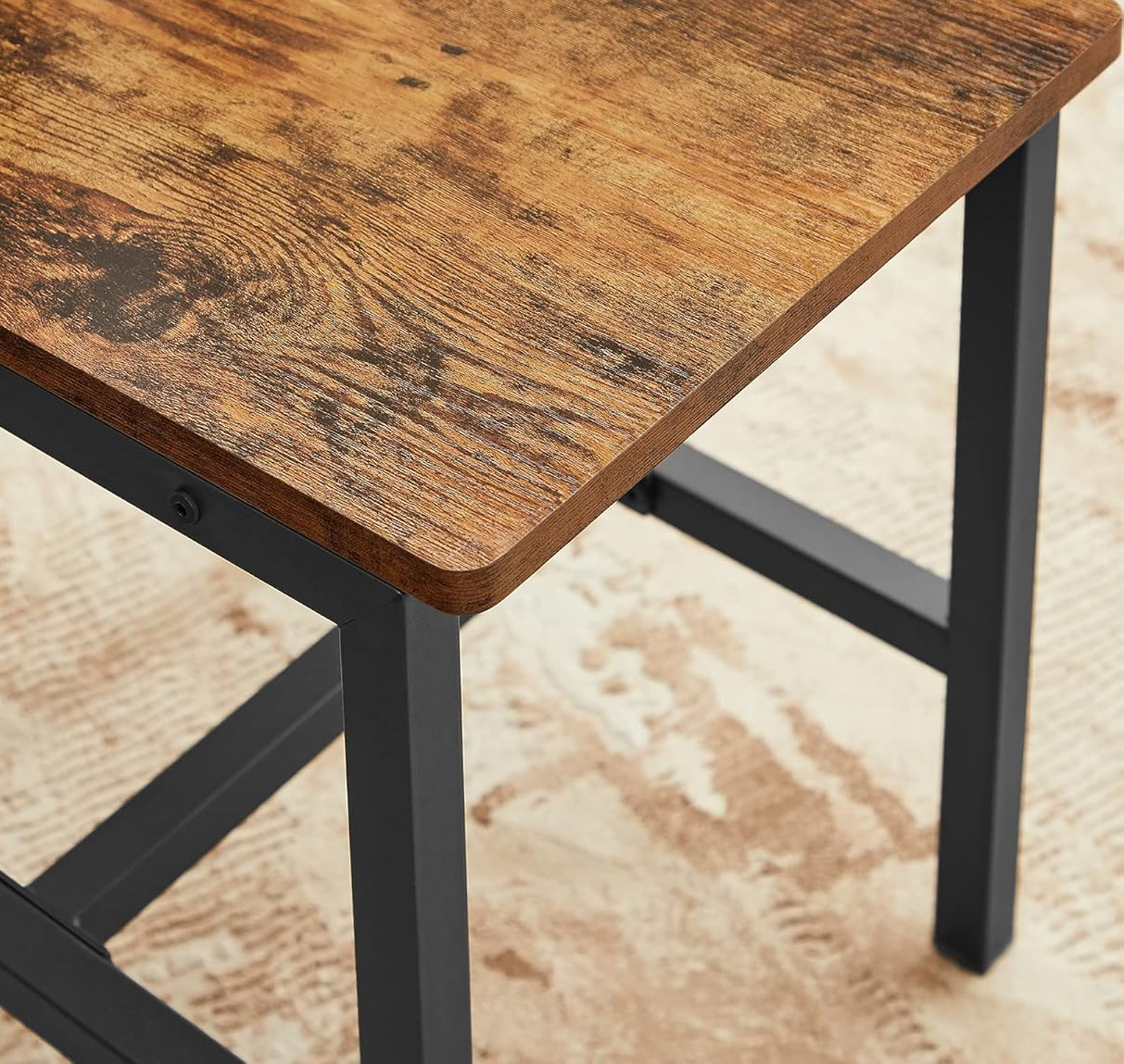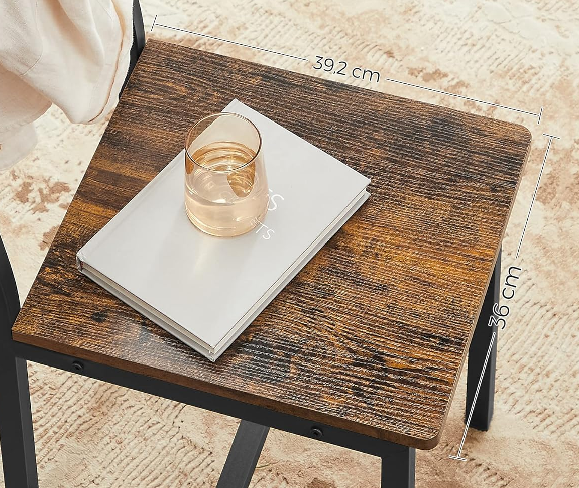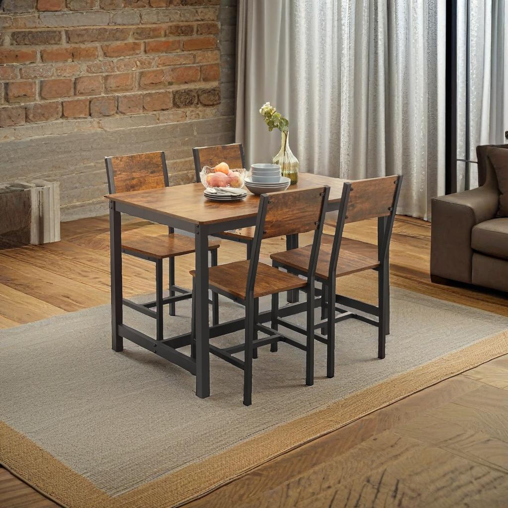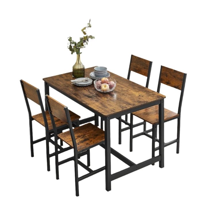 Elevate your dining space with this stylish set of 4 industrial dining chairs, featuring a sturdy ink black steel frame paired with warm rustic brown particleboard seats. Designed with comfort in mind, the ergonomic 102° angle between the backrest and seat supports you during every meal. The strong steel frame and bottom crossbar ensure maximum stability, while the easy-to-follow assembly instructions make setup a breeze. Perfect for your dining room, kitchen, or living room, these chairs blend functionality with rustic charm to complement a variety of interior styles. (NO TABLE)