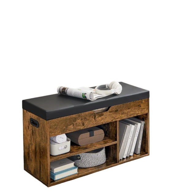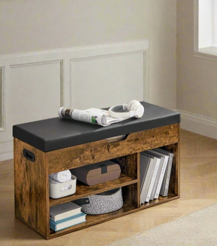 No more balancing against the wall while putting on your shoes this shoe rack with a padded seat offers a comfortable and practical solution. The sturdy engineered wood structure supports up to 150 kg, while the 4 cm thick soft cushion provides a cozy place to sit and change your shoes.