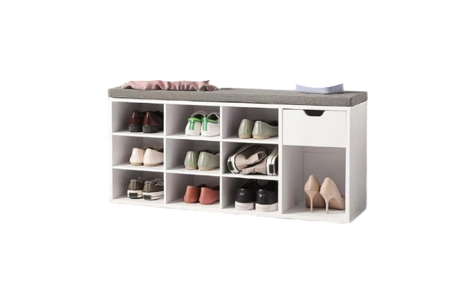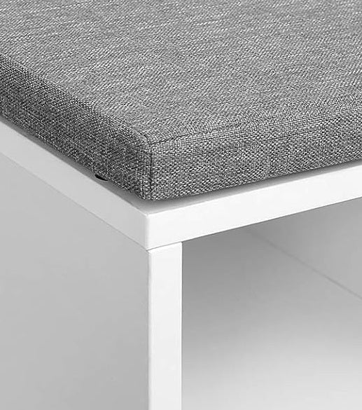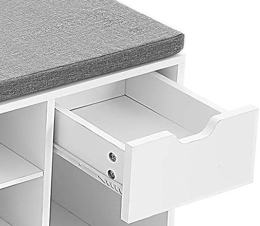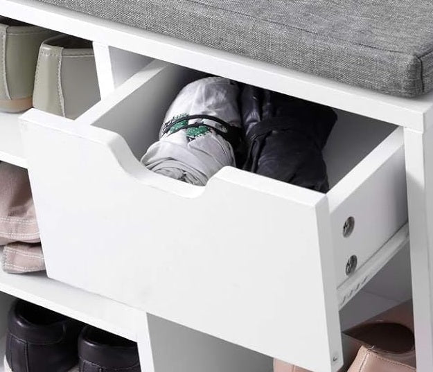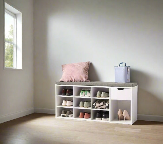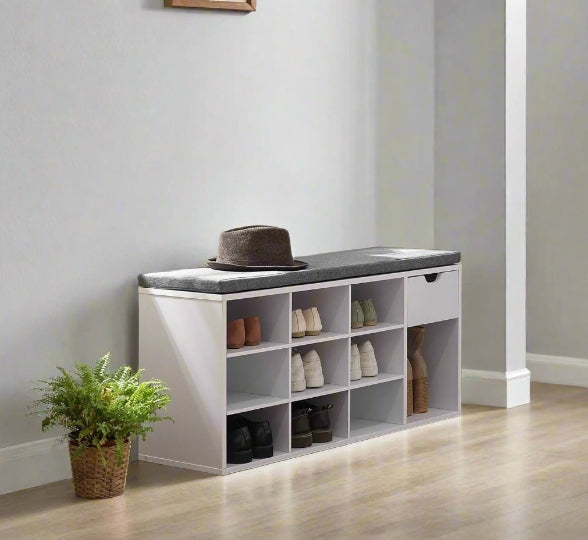 Keep your hallway organised and stylish with this versatile shoe storage bench in white and grey. Featuring a comfortable padded seat and a handy small drawer, it offers a perfect spot to sit while putting on shoes and a secure place to store your keys, wallets, or other essentials. The open compartments include a larger section, providing flexible storage for shoes, boots, or storage boxes of various sizes.