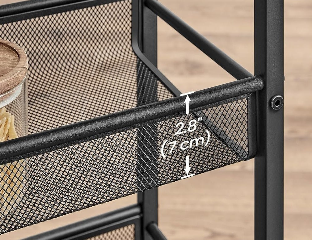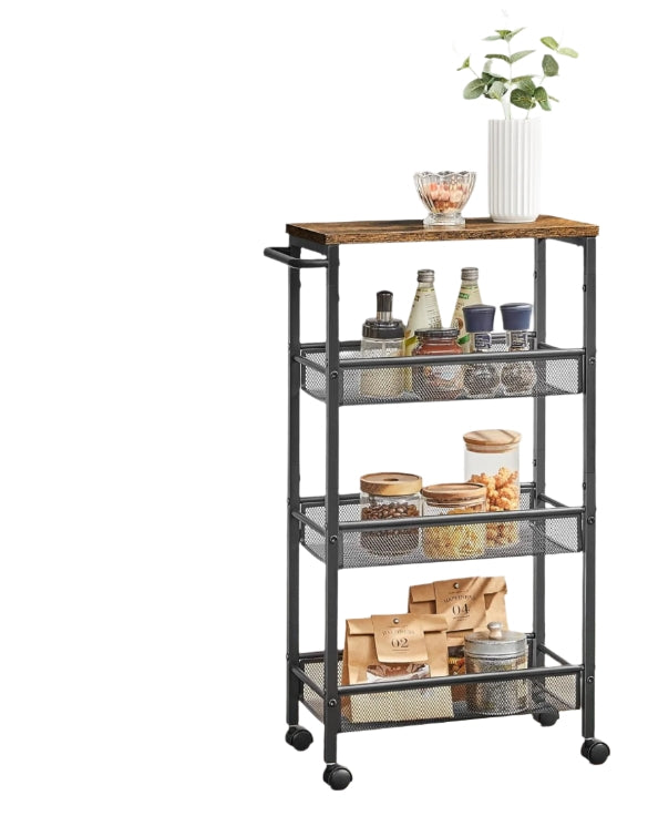 Maximise your space with this slim 4-shelf rolling trolley—perfect for tight corners in your kitchen, bathroom, or home office. Measuring just 22 cm deep, it easily fits into narrow gaps while offering generous vertical storage. With three mesh shelves and a top wooden surface, you can store anything from spice jars to cleaning supplies. The sturdy steel frame, castor wheels, and side handle make this trolley durable and easy to move.