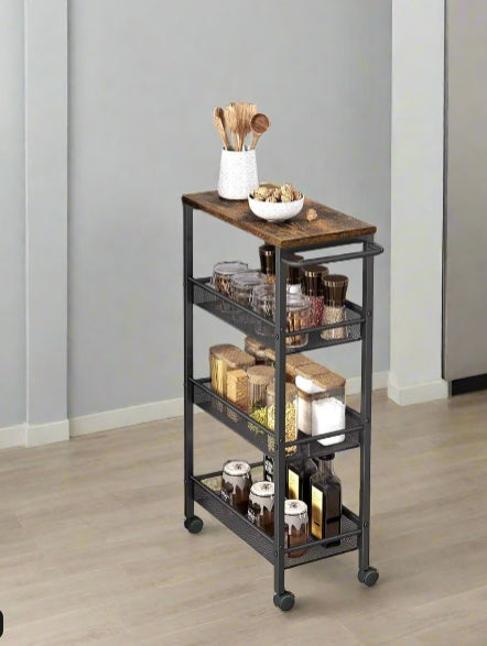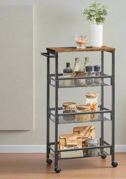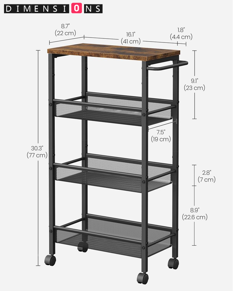 Slim 4-Shelf Rolling Trolley, Space-Saving Kitchen Cart with Wheels, Rustic Brown and Black