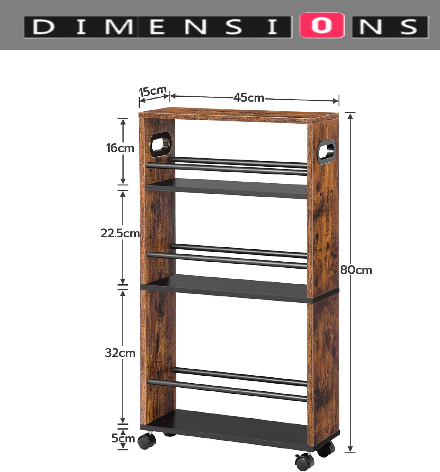 Maximize every inch of your home with this Slim 4-Tier Rolling Kitchen Trolley, perfect for narrow spaces in kitchens, bathrooms, laundry rooms, or living areas. Designed to fit tight gaps, this space-saving trolley measures just 45 x 15 x 80 cm, making it an ideal storage solution where room is limited.