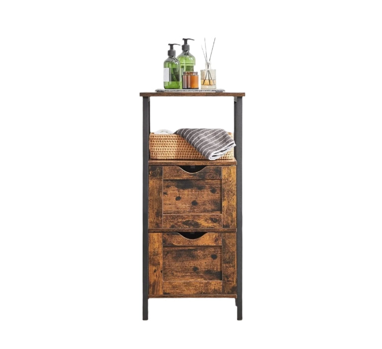 Featuring a sturdy tabletop for toiletries or décor, one open compartment for easy-access essentials, and two versatile drawers (which can be rearranged as needed), this cabinet makes organising small spaces effortless. Adjustable feet and a durable steel frame provide extra stability, while the included anti-tip kit ensures safe placement—even on uneven floors.