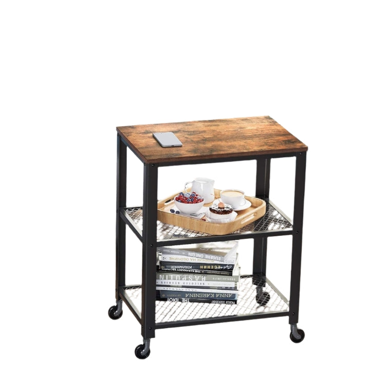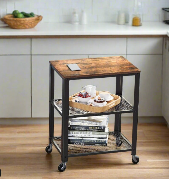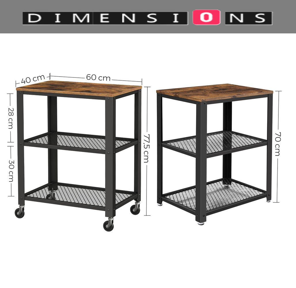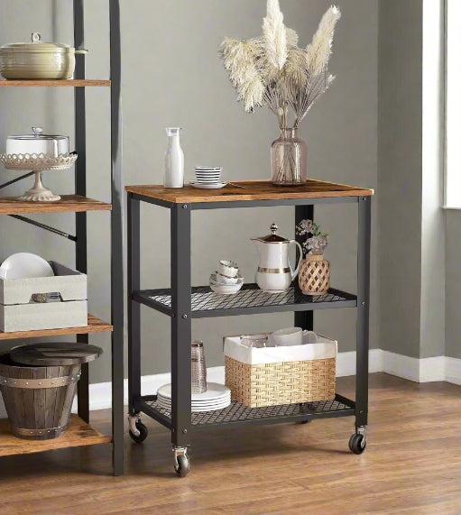 Add rustic charm and mobile convenience to your home with this vintage 3-tier serving trolley. Crafted from durable particleboard and a strong metal frame, this industrial-style cart offers stability and water resistance for everyday use. Whether you're serving drinks, storing cookware, or displaying décor, the spacious tiers help keep everything organized and within reach. Smooth-rolling wheels make it easy to move from kitchen to living room, and adjustable feet provide added stability when stationary.